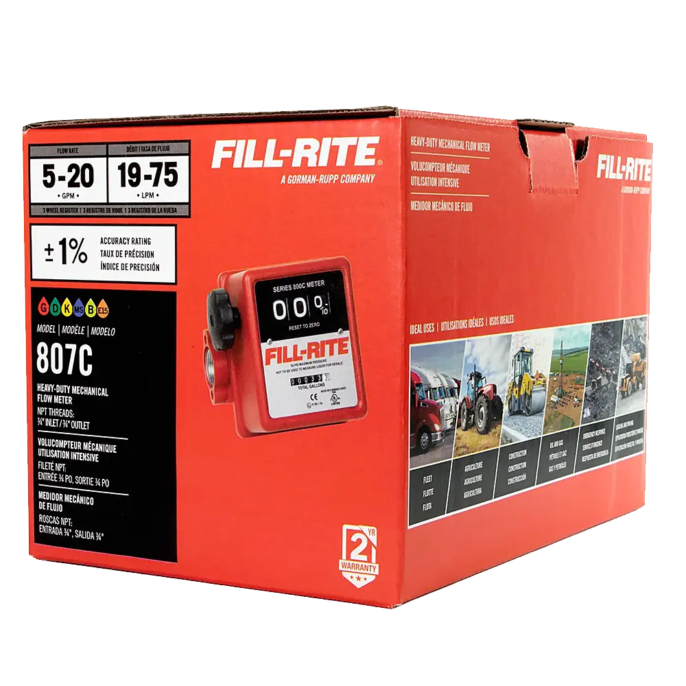 The Fill-Rite 807C 3-digit mechanical fuel transfer meter is built for precision and long-term reliability. Designed for low-volume fueling, it delivers flow rates from 5 to 20 GPM with +/- 1% accuracy. This ensures dependable record-keeping for technicians and businesses that require consistency in fuel tracking.