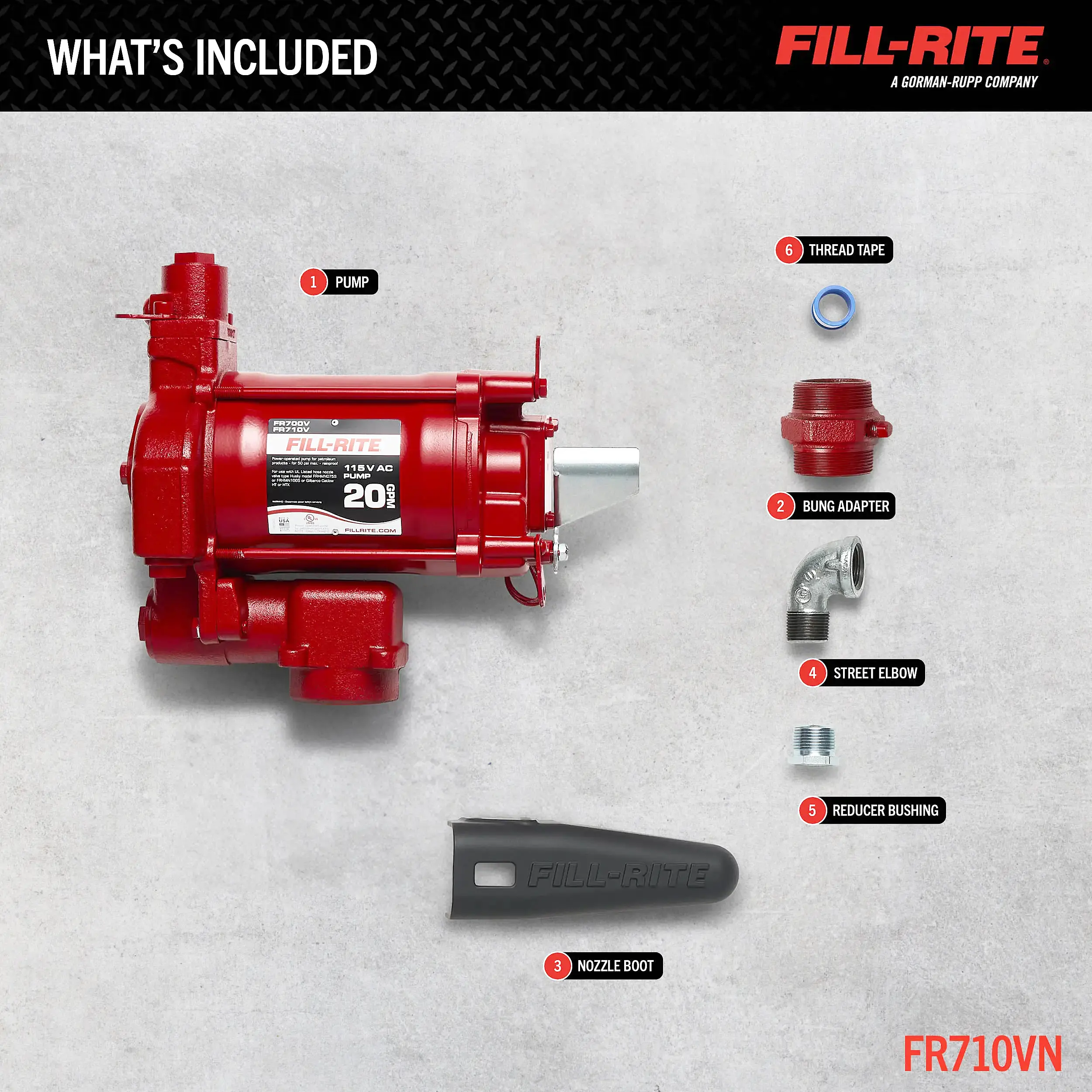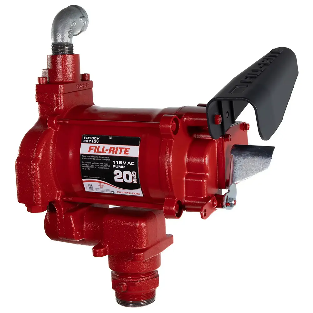 The Fill-Rite FR710VN is a 115V AC, 20 GPM heavy-duty fuel transfer pump built for durability and consistent performance. Its cast-iron construction and rotary vane technology ensure long life and reliable fuel handling for stationary tank applications.