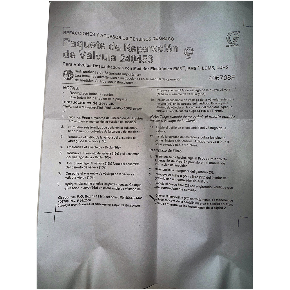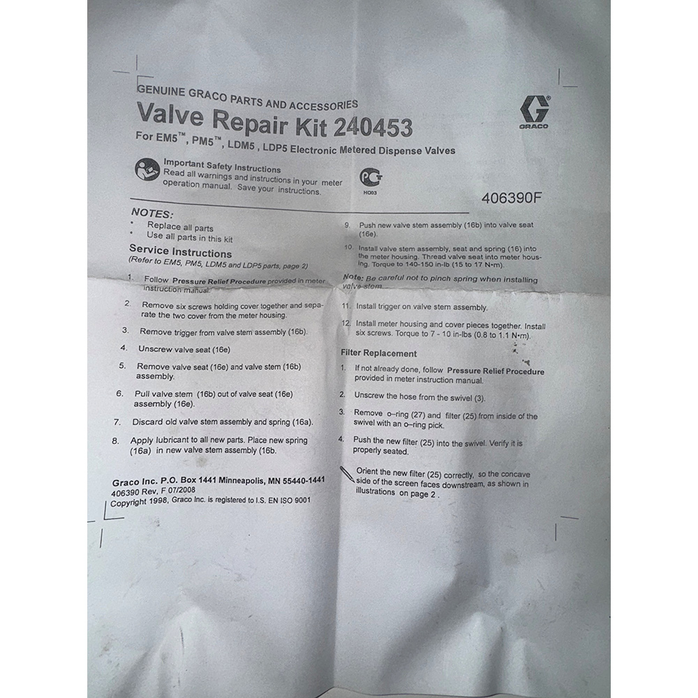 Moreover, installation is straightforward. Technicians can complete service quickly using standard tools. This Graco 240453 kit supports several LDM5 valve models including 25H325, 24H326, and 24H327. Whether in a fleet maintenance shop or automotive service center, this kit offers a dependable solution to extend the life of your dispense valve.